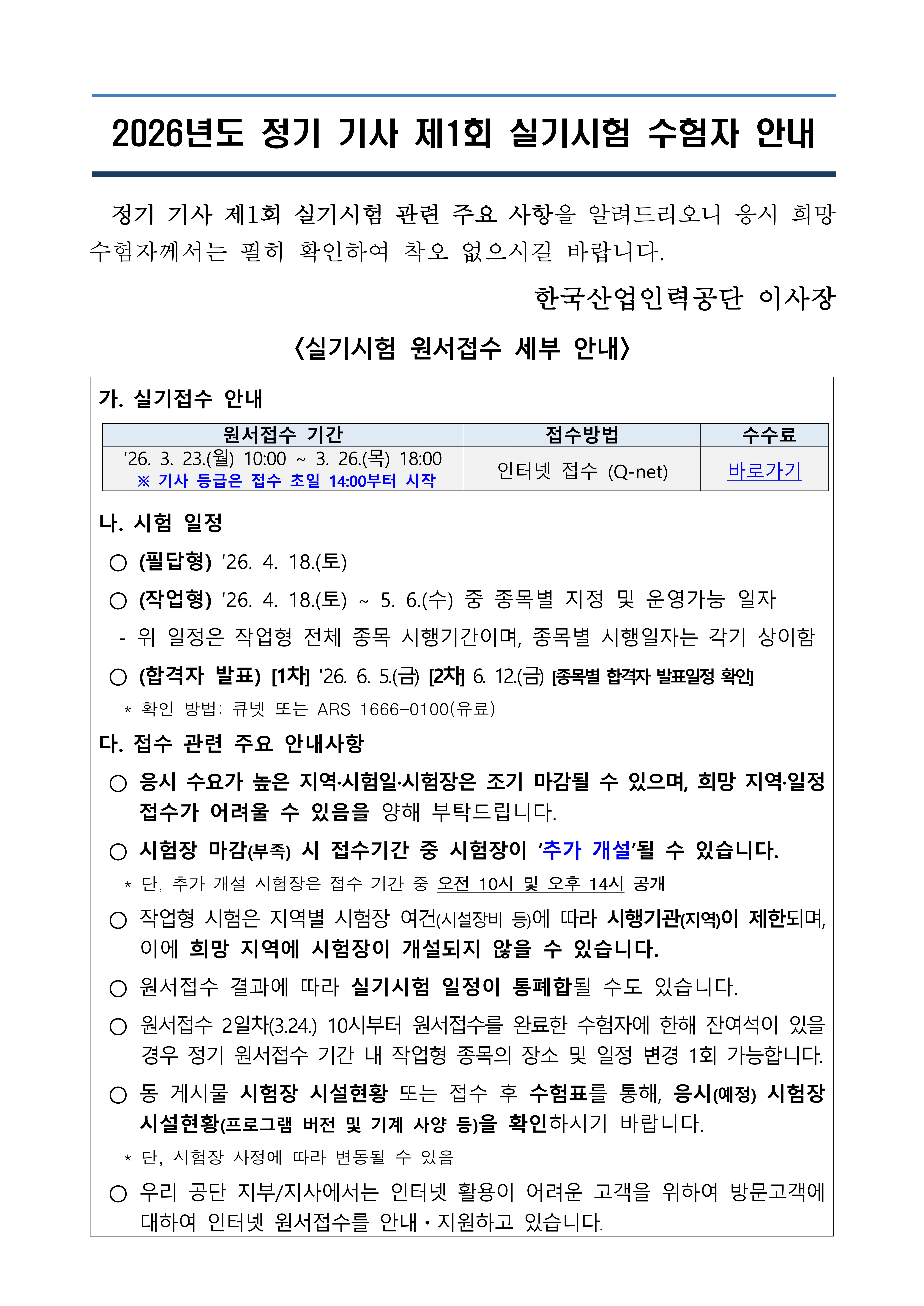 2026년도 정기 기사 제1회 실기시험 원서접수 안내