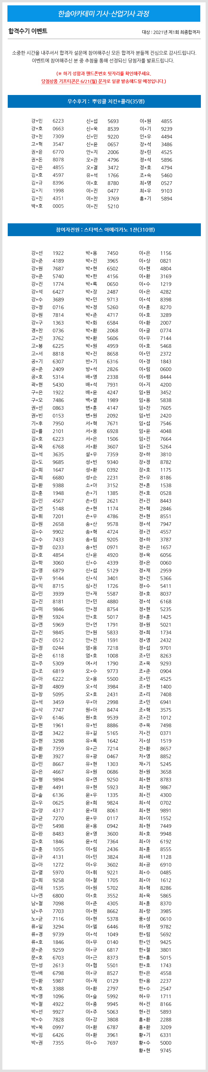 2021년 제1회 건축/전기/토목(산업)기사 합격자 이벤트 당첨자 발표